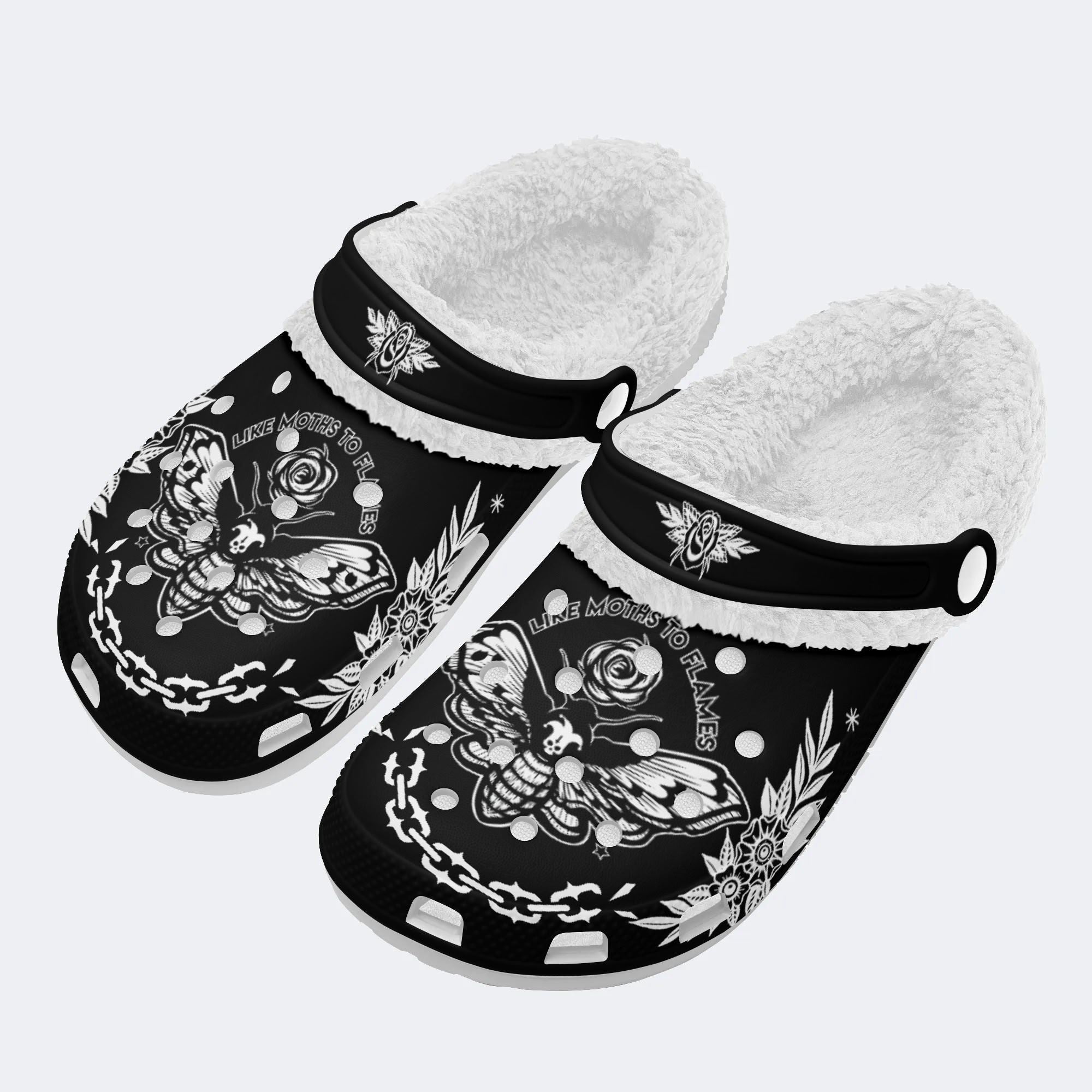 Rose Death Moth Vintage Print- Fur Lined Slippers/SandalsRose Death Moth Vintage Print- Fur Lined Slippers/Sandals