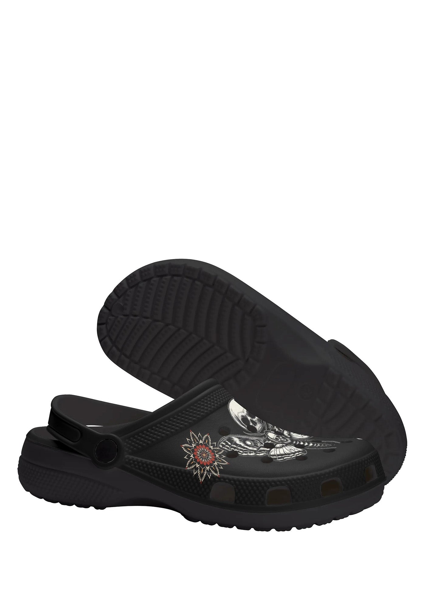 Step into the void. These black slippers feature an ominous death moth with skull wings, flanked by sacred geometry and gothic florals. Made for rebels who worship darkness in comfort.