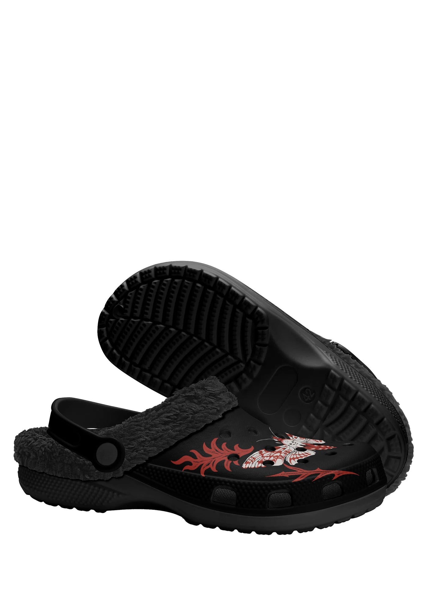 These black fuzzy slippers feature a venomous red and white moth with flame tattoo wings and skull head. Designed with a cozy fleece lining and goth-inspired details for a perfect clash of comfort and chaos.