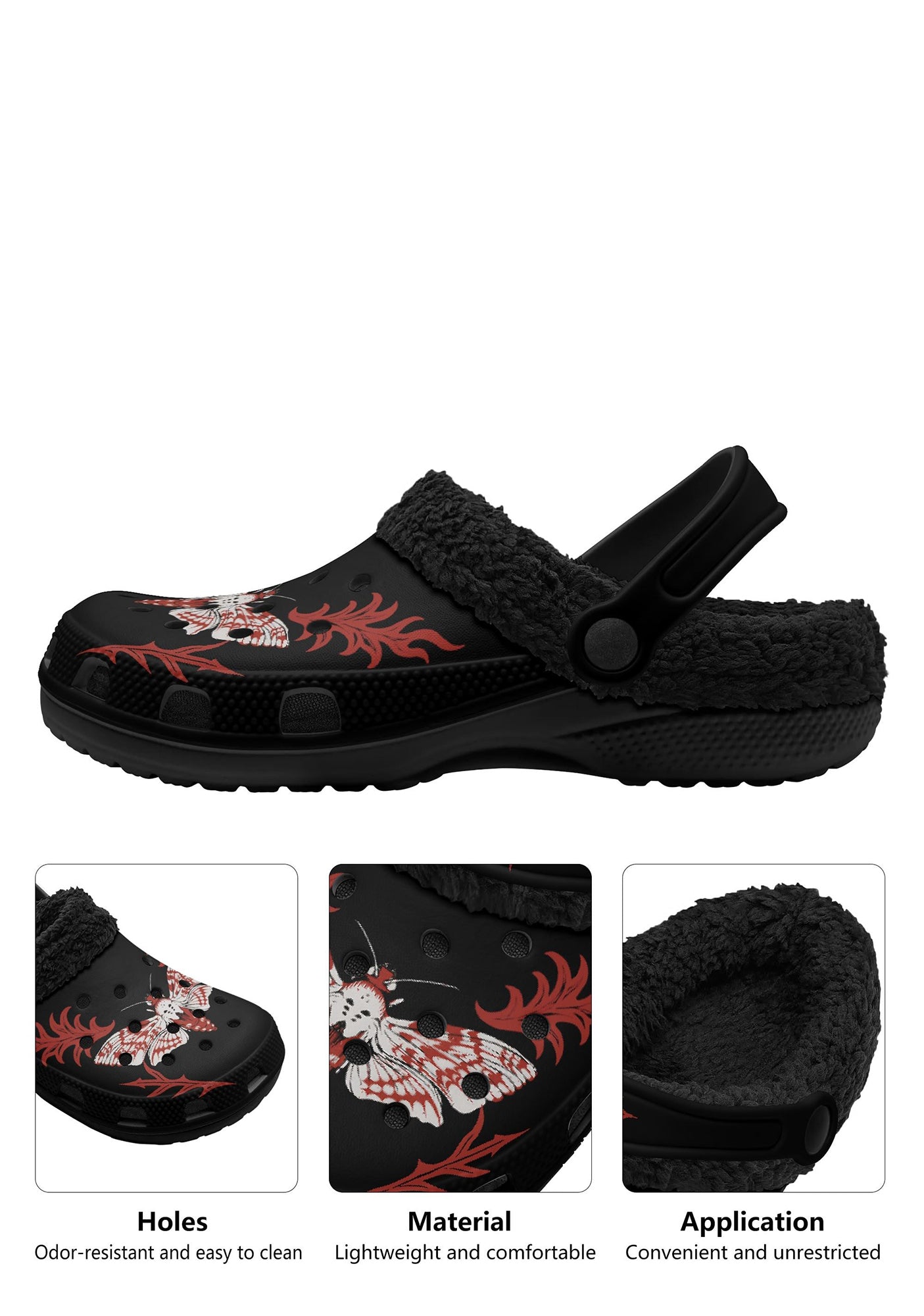 Venom Moth slippers – front view of fuzzy black clogs with red and white moth designOuter side of slippers with flame-winged skull moth on black base