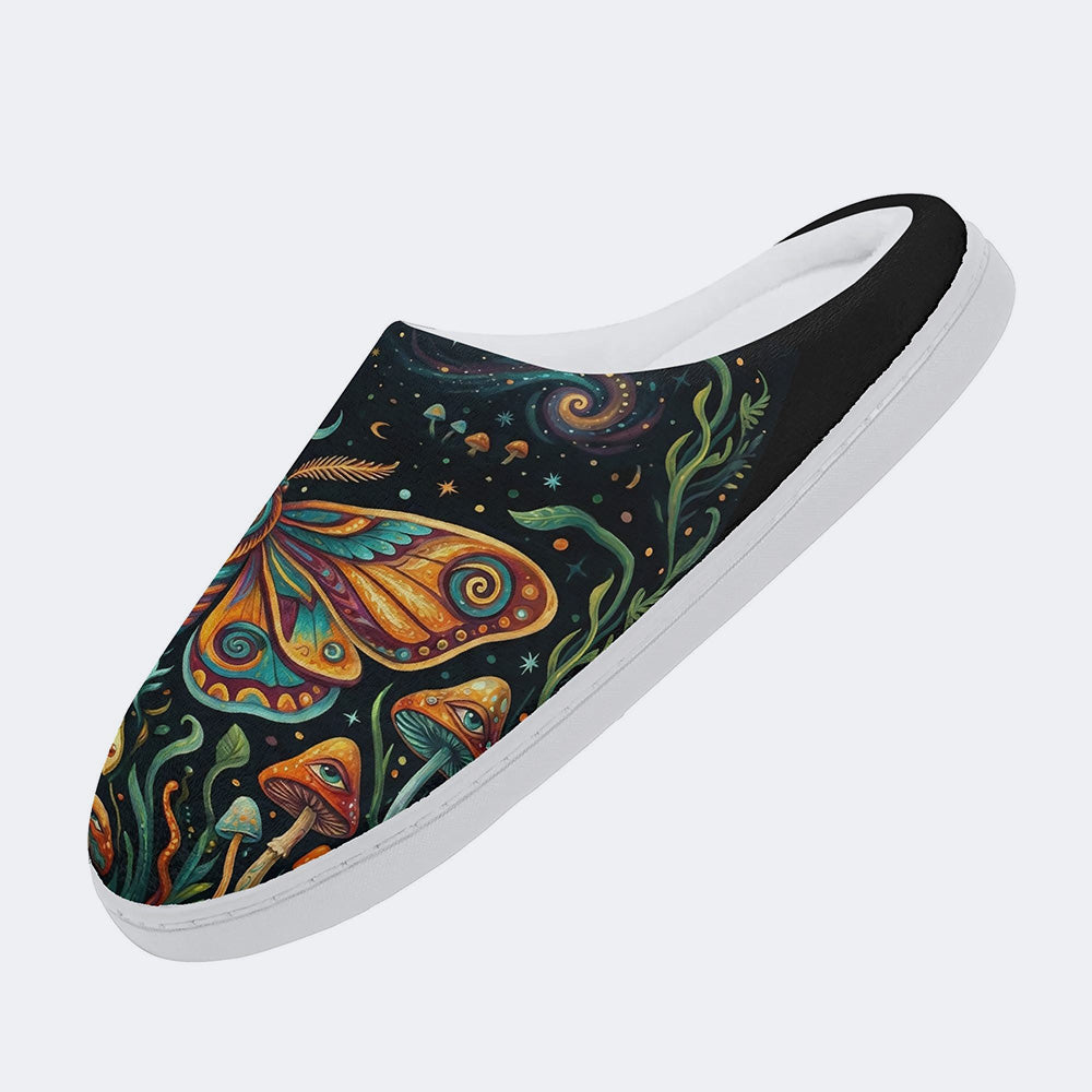 Psychedelic Mushroom Forest Moth Retro Print Fleece-Lined SlippersPsychedelic Mushroom Forest Moth Retro Print Fleece-Lined Slippers
