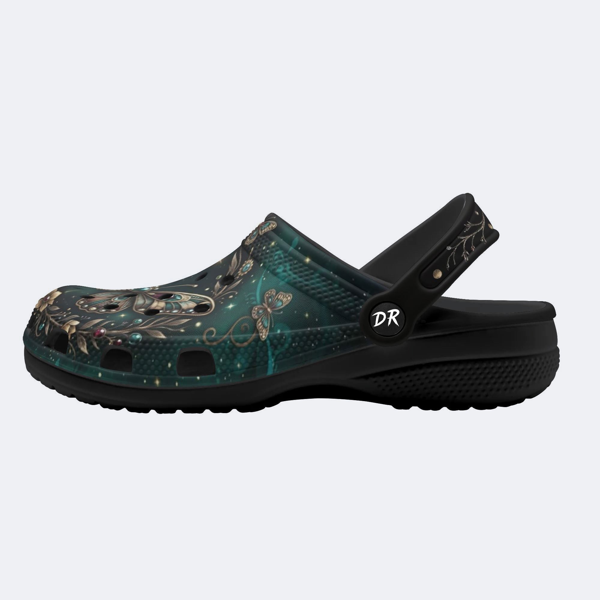 Dark Night Radiant Gem Butterfly Dance Print Fleece-Lined Clogs