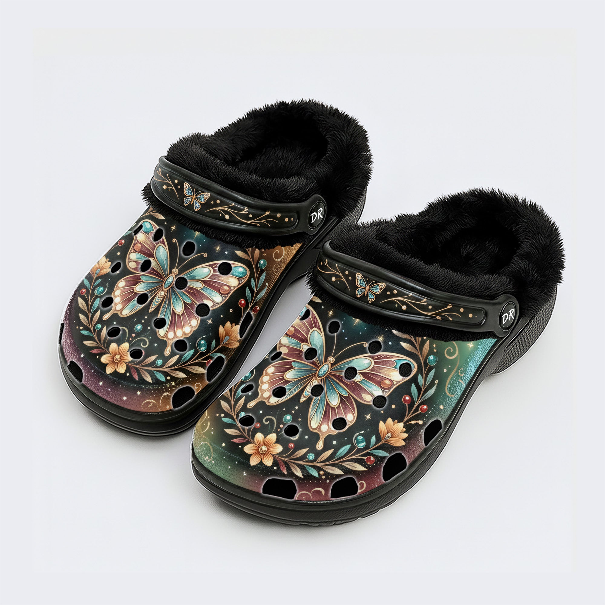 Fantasy Butterfly Flower Cluster Print Fleece-Lined ClogsFantasy Butterfly Flower Cluster Print Fleece-Lined Clogs