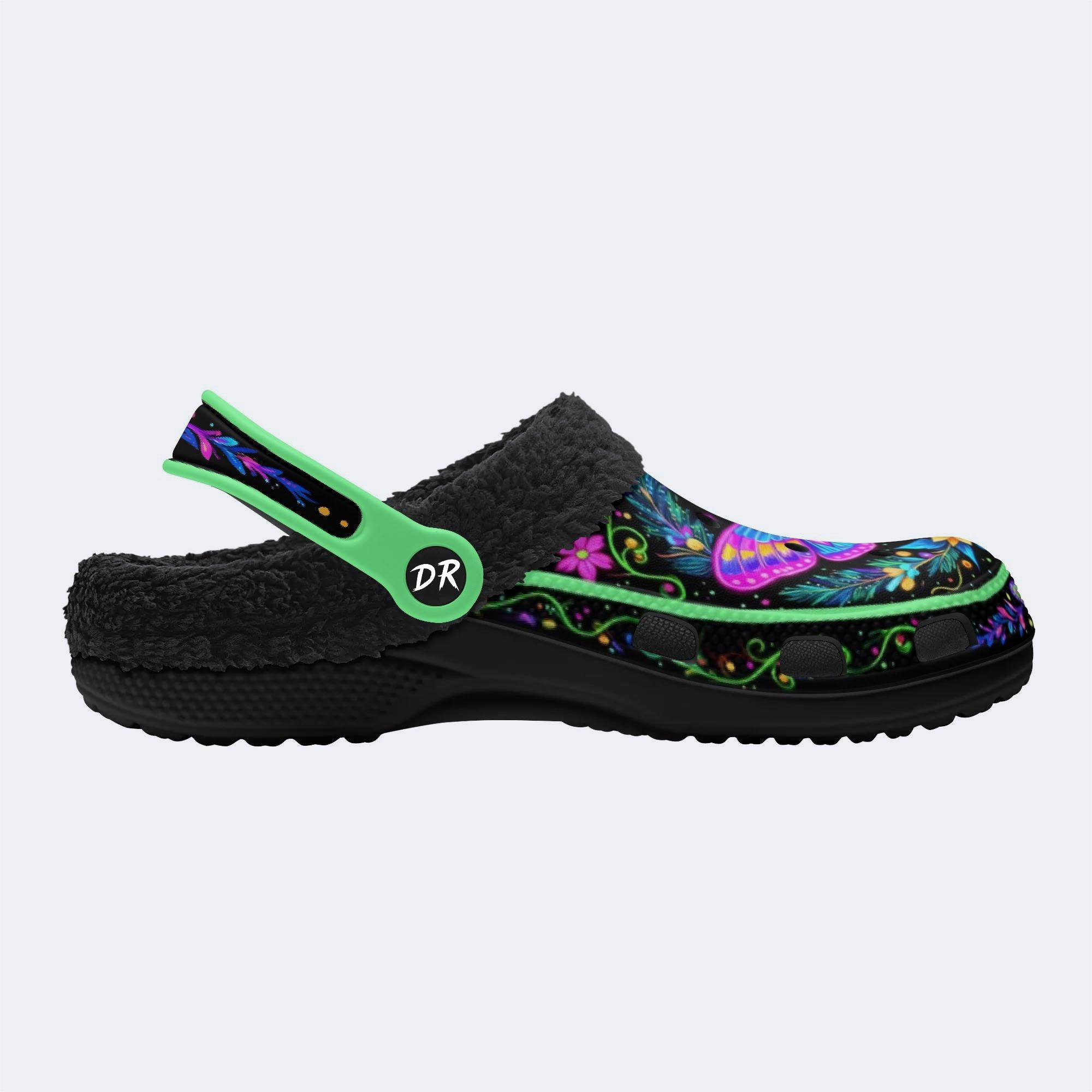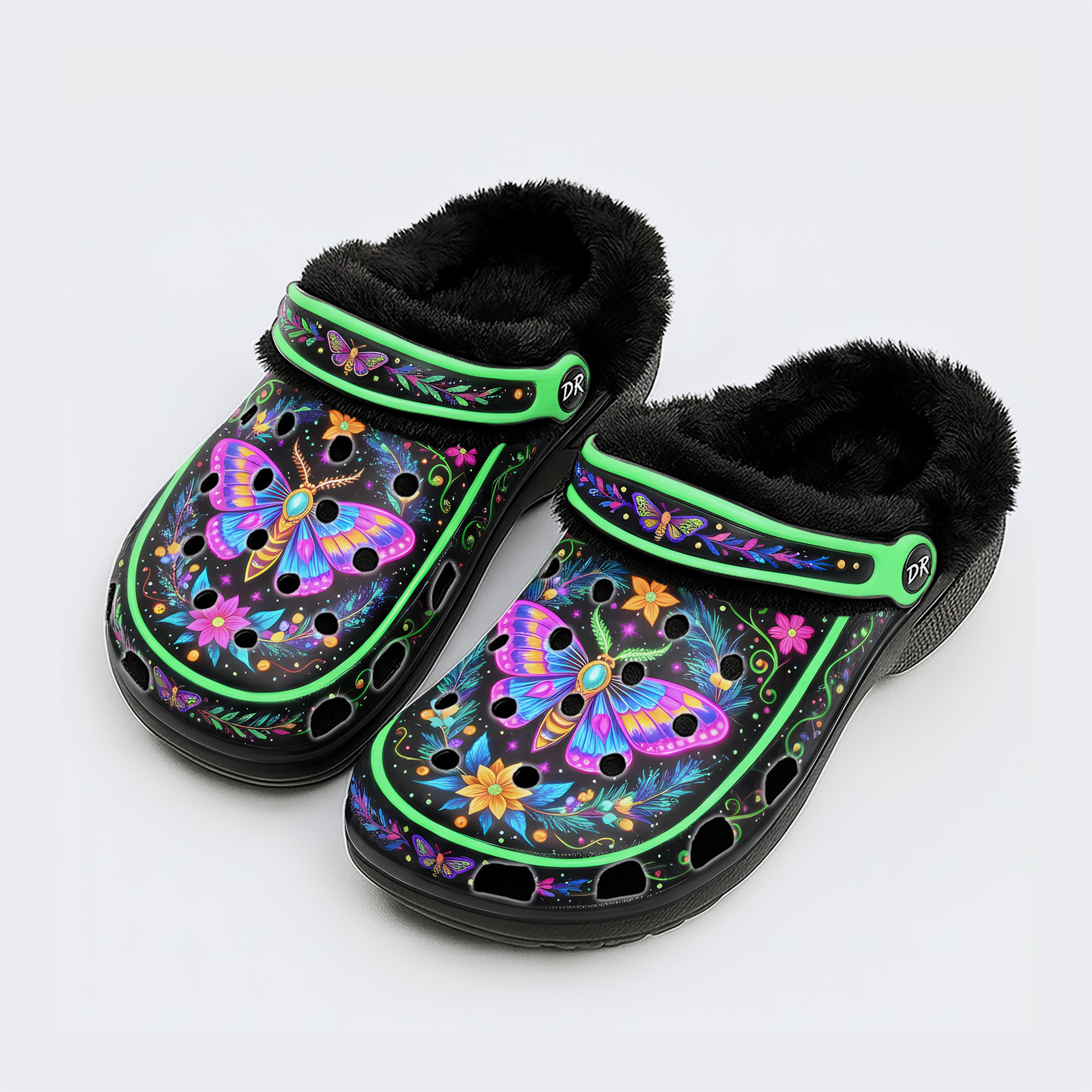 Fluorescent Moth Wreath Print Fleece-Lined Clogs